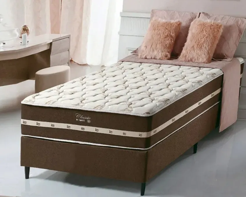 olchão Solteiro bio classic - Fabricante: bioflex - Cor em Marrom. - Tecido em malha, com faixas em tecido liso poliéster - Estofamento em Espuma D28 - Molas ensacadas - Sistema de molejo fio continuo entrelaçado - Base em Poliestireno eXPANDIDO (ESP), com isolamento térmico e tratamento actguard Dimensões: - Altura:22 cm - Largura: 88 cm - Profundidade: 188 cm
