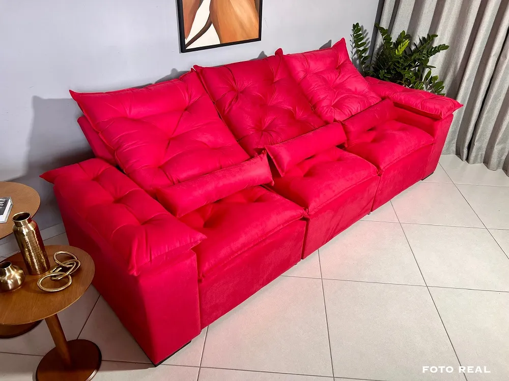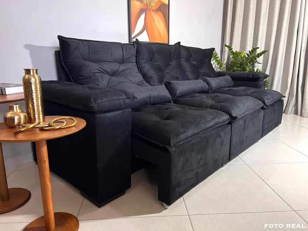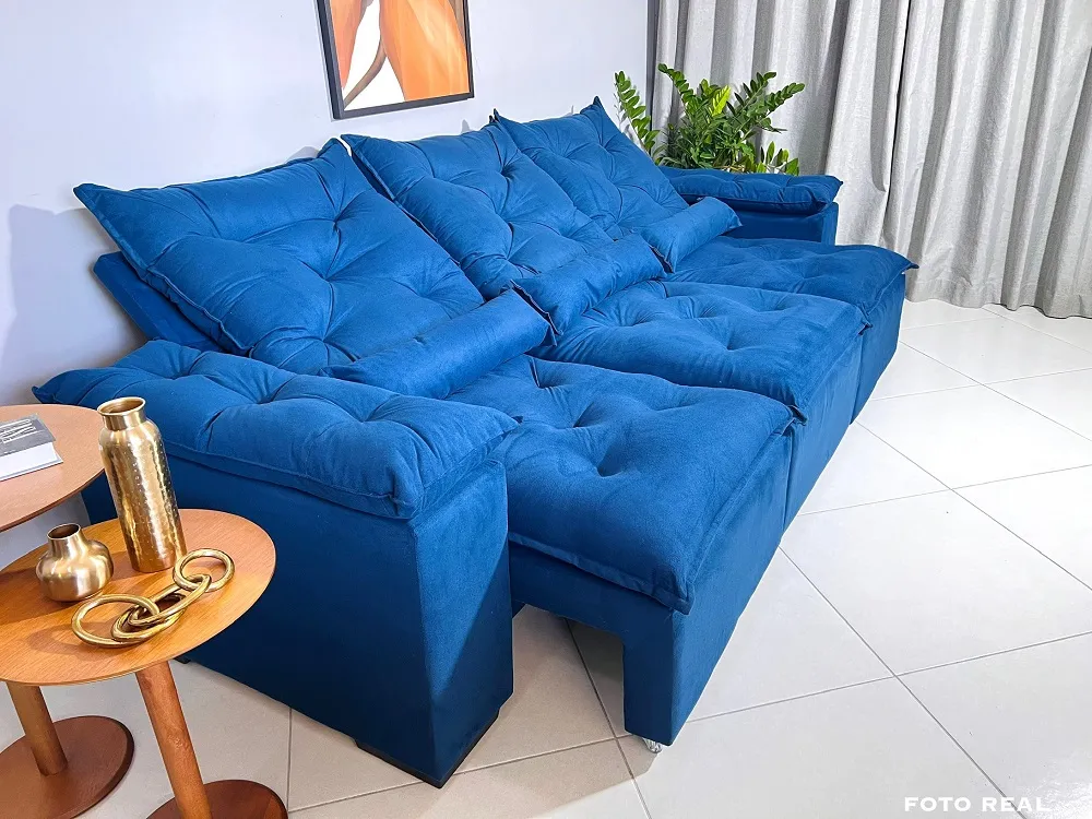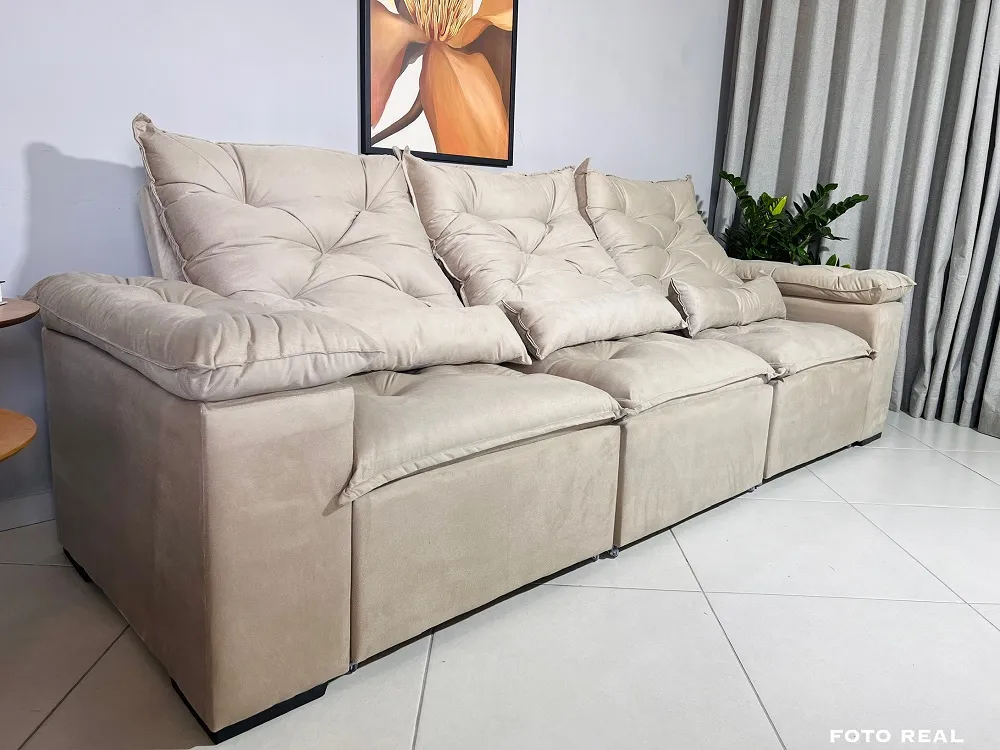 Sofá Retrátil e Reclinável Tunísia 3 Módulos - Fabricante: Kasacomigo Estofados - Cores em Azul, Bege, Cinza ou Marrom - Eucalipto tratado 100 % reflorestado - Pillow no assento 12 cm - Espuma D26 - Suede Dimensões Altura: 90 cm Largura: 269 cm Profundidade: 110 cm Profundidade Aberto: 135 cm