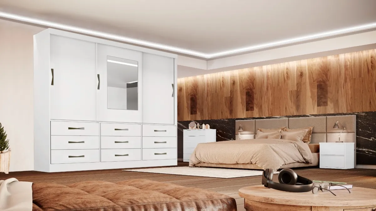 Guarda-Roupa Athenas 3 Portas 9 Gavetas - Fabricante: Bianchi - Cores em Branco ou Nature/Off White - 100% MDP - Corrediças telescópicas - Cabideiro em alumínio - Trilho inferior em alumínio - Espelho Dimensões Largura: 180 cm Altura: 208 cm Profundidade: 47 cm