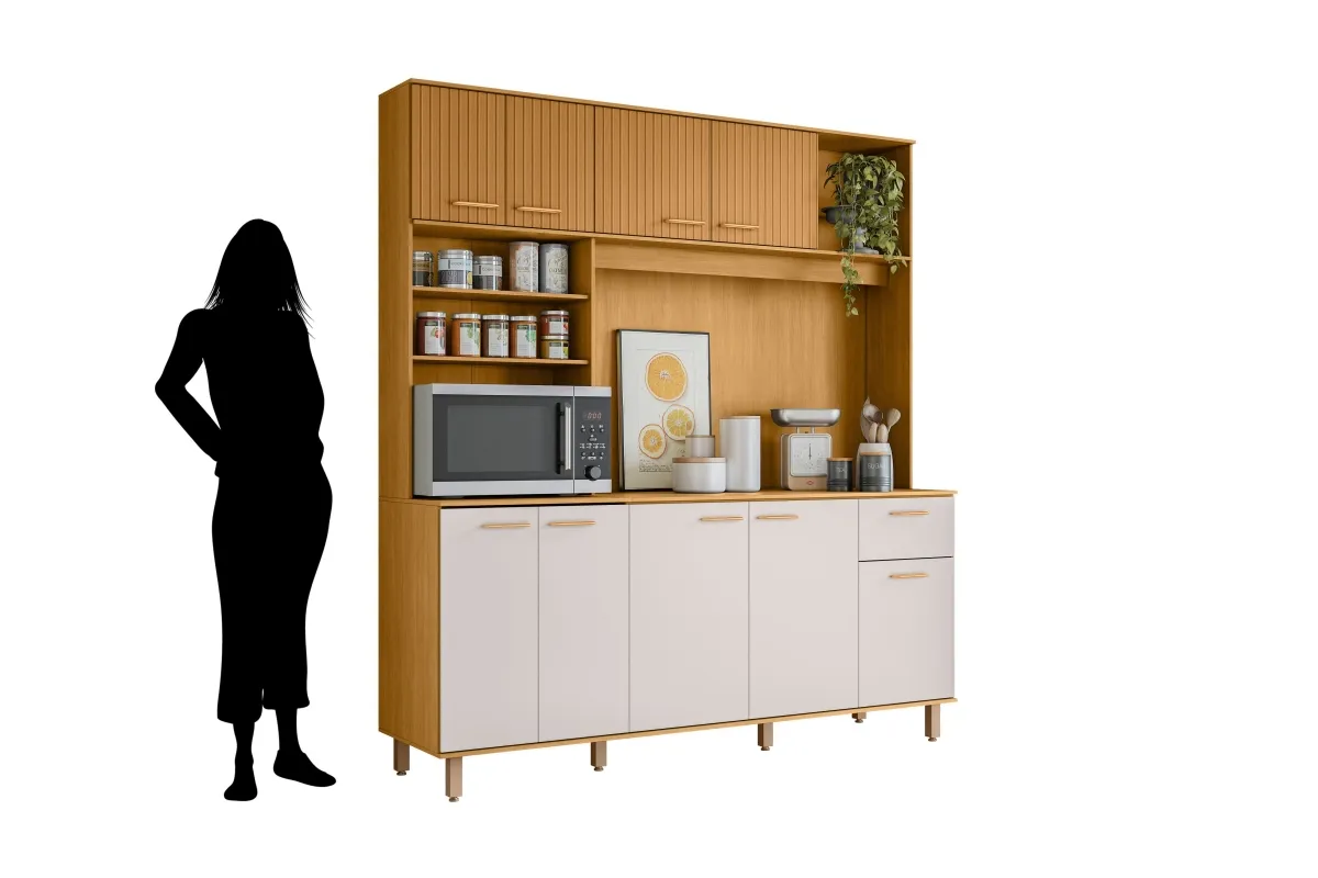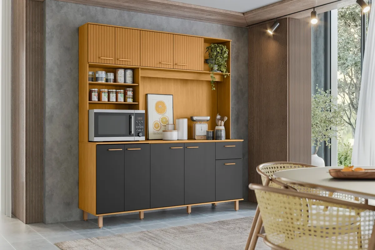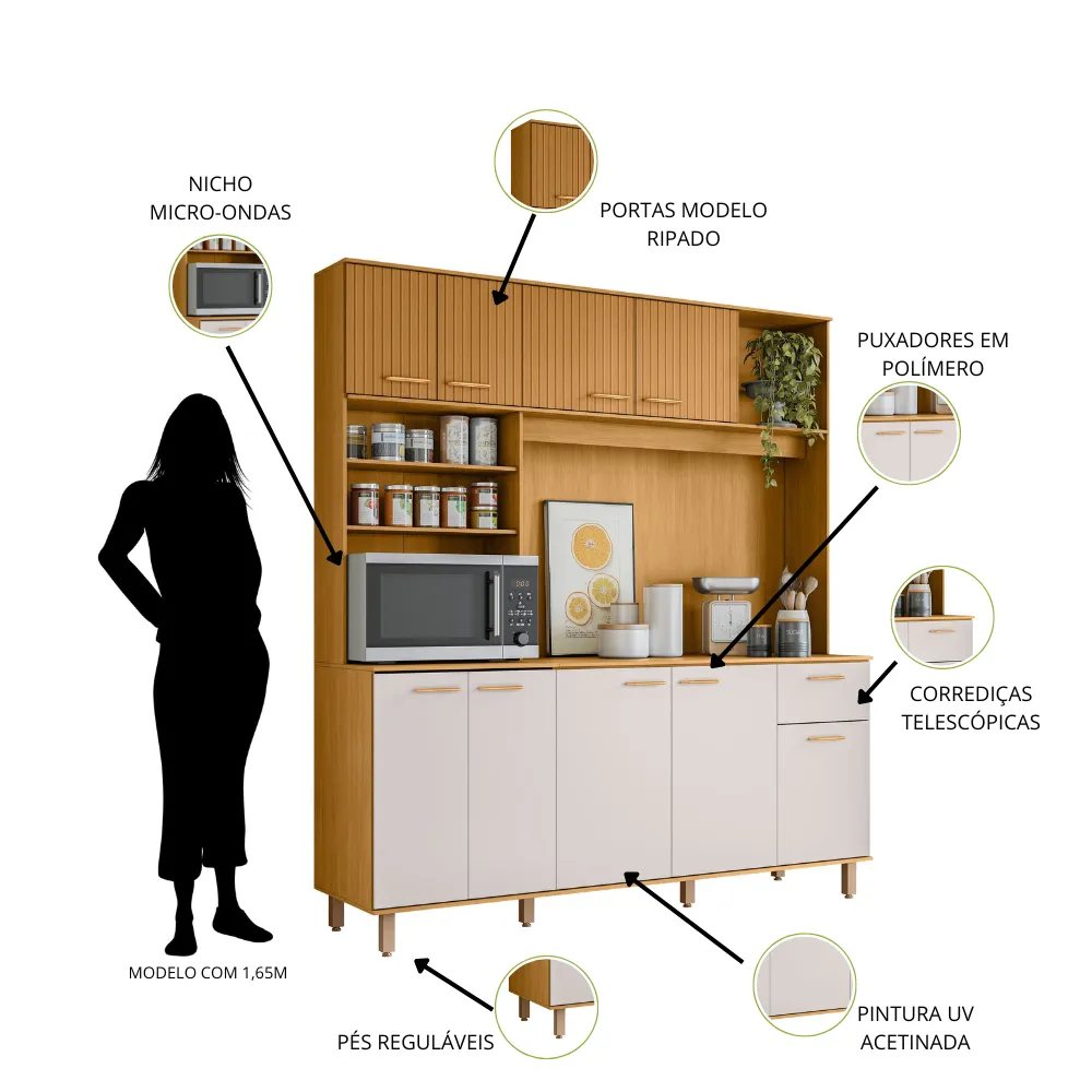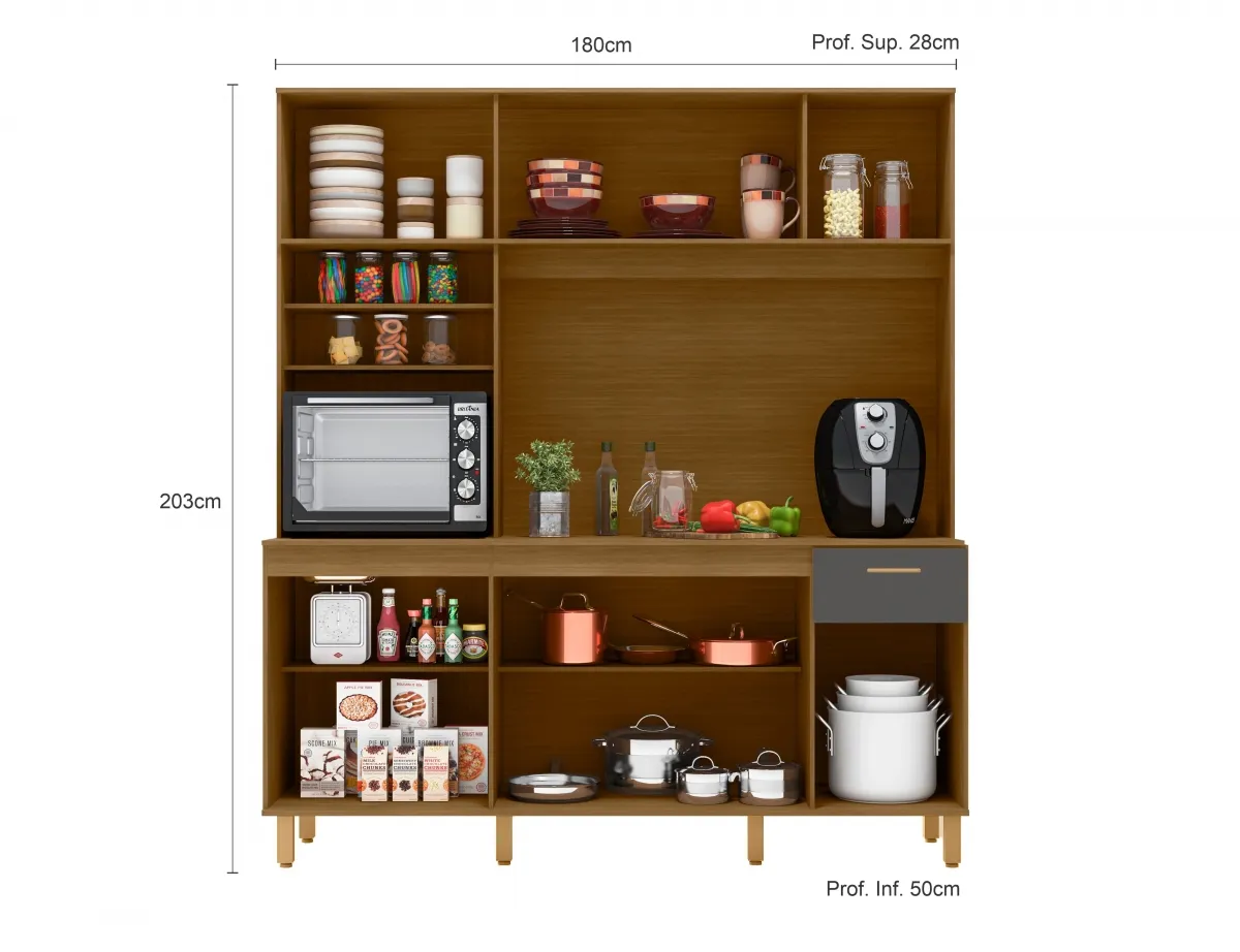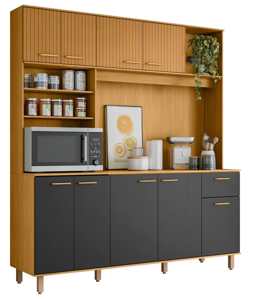 Kit Cozinha Núria - Fabricante: Poliman - Cores em Freijó Ripado/Grafite ou Freijó Ripado/Off White - MDP Perffect Touch - Nicho para Microondas (A.38cm x L.56cm x P.50cm) - Nicho decorativo - Adaptável para cuba/pia - Corrediças telescópicas Dimensões: - Altura: 203 cm - Largura: 180 cm - Profundidade: 50 cm