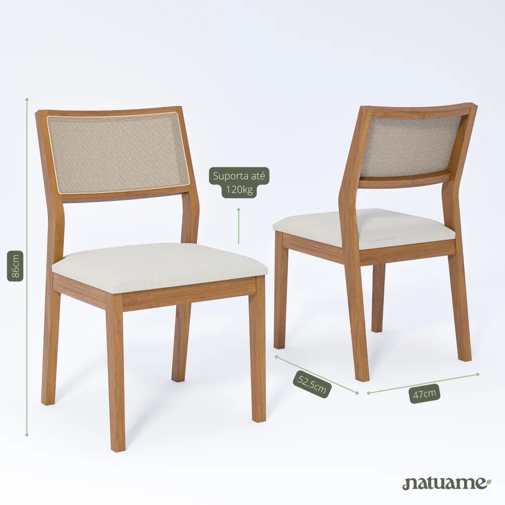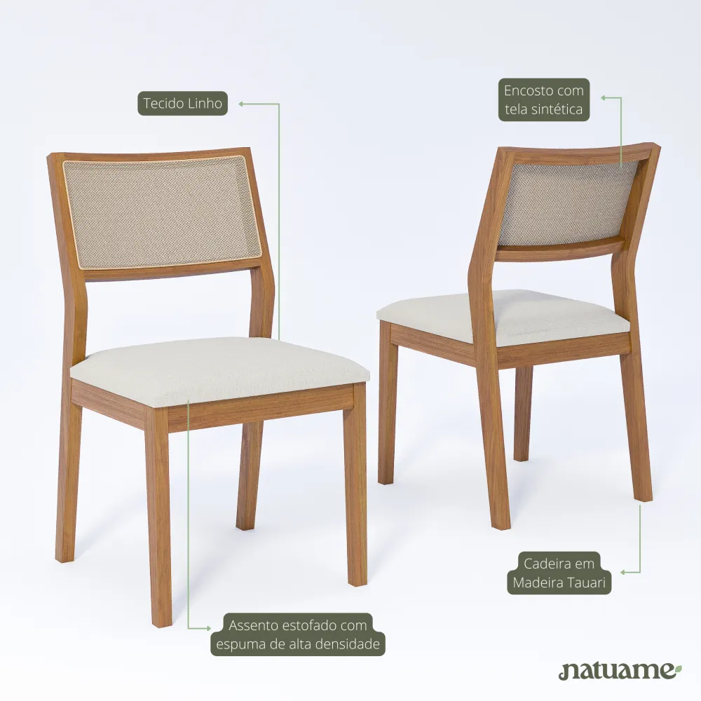 ?Kit 2 Cadeiras Oiti Natuame - Fabricante: Cimol - Cor em Linho Cru - Tecido Linho - Encosto com tela sintética - Cadeira em madeira tauri - Assento estofado com espuma de alta densidade - Suporta até 120Kg Dimensões: - Altura: 86 cm - Largura: 47 cm - Profundidade: 52,5 cm