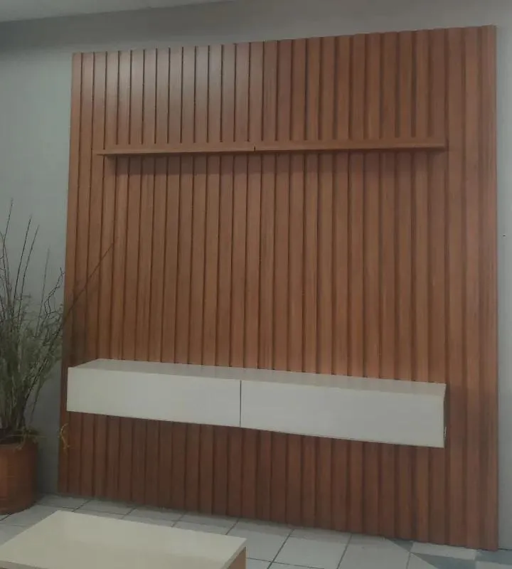 Painel Ripado Project 2.65 com Kit Gaveta + Módulo 0.5m - Fabricante: Mobler Móveis - Cores em Cinamomo/Mel/Off White - Estrutura MDP - Espaço para TV de até 75" - Corrediça Telescópica - Módulos podem ser vendidos separadamente Dimensões Altura: 265 cm Largura: 250 cm Profundidade: 37,6 cm