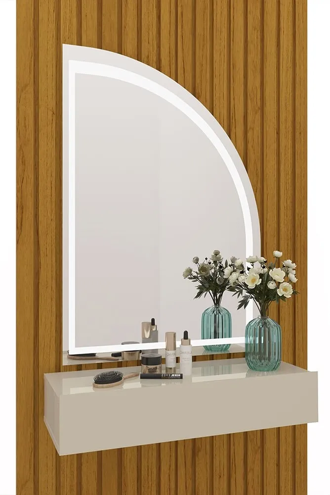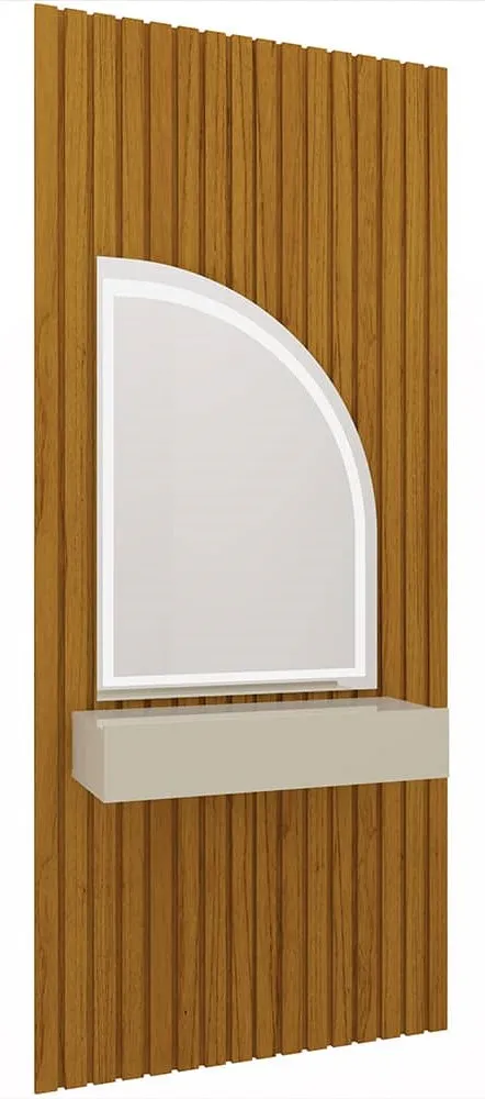 Penteadeira Realeza - Fabricante: Gelius - Cores em Naturale/Off White - 100% MDF - Corrediças telescópicas - Espelho de design curvo - Nicho com divisórias móveis - Espelho jateado com LED - Nicho com bordas chanfradas e laqueadas Dimensões Altura: 250 cm Largura: 94,4 cm Profundidade: 35,5 cm