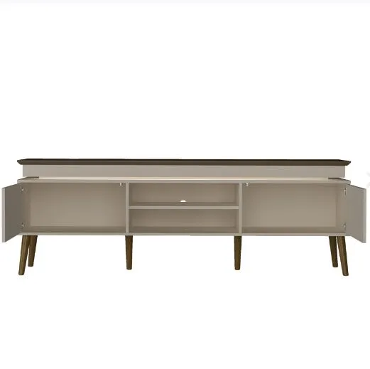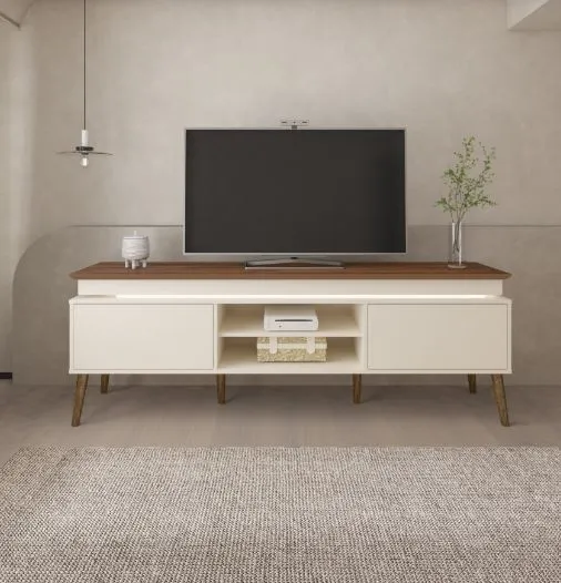 Rack Lumina - Fabricante: Artely - Cores Pinho/Off White - MDP/MDF - Tampo com Borda Invertida - LED Embutido - Pés de Palito em Madeira Maciça - 2 Portas com fecho toque - Suporta TVs de Até 75" Dimensões Altura: 62,5 cm Largura: 180 cm Profundidade: 41,5 cm