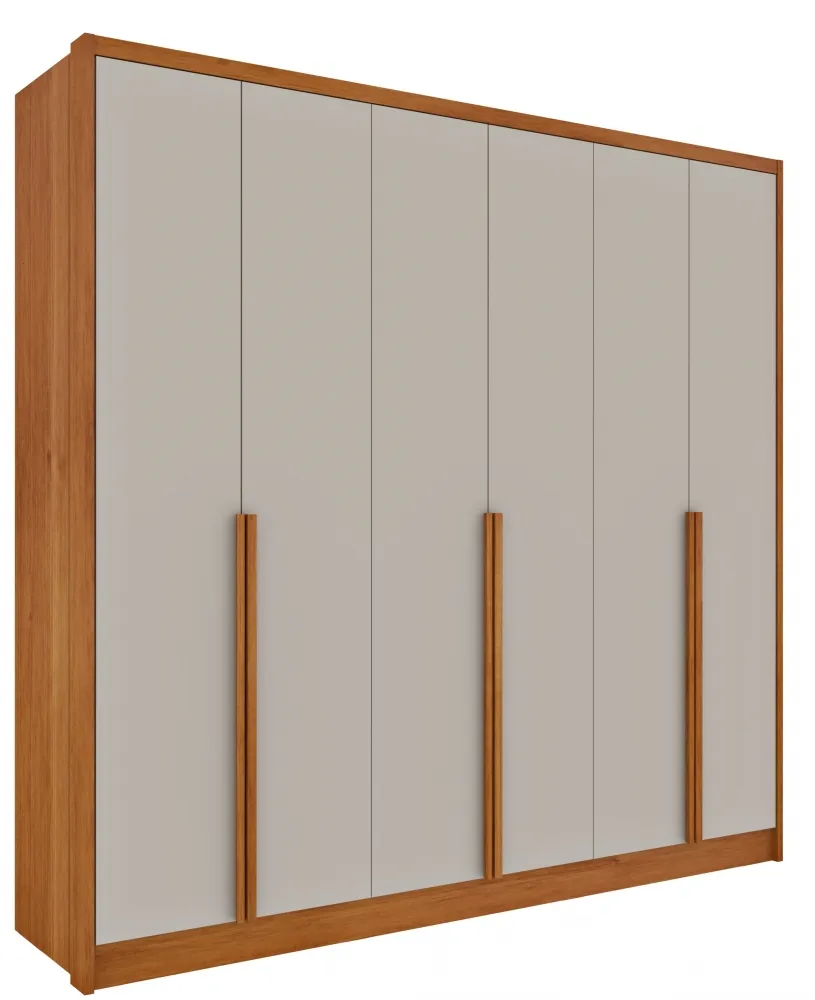 Roupeiro 6 Portas Fortuna - Fabricante: Tcil Móveis - Cores em Cinamomo/Off White - MDF - Coluna lateral em MDF 25mm - Cabideiro em alumínio - Distanciadores das gavetas em MDF - Corrediças telescópicas - Puxadores em MDF - 4 Dobradiças 26mm por porta - Costas inteiriças Dimensões Altura: 234 cm Largura: 243 cm Profundidade: 46 cm