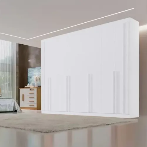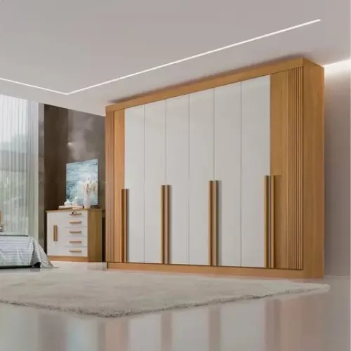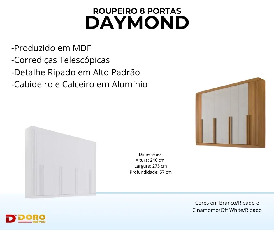 Roupeiro 8 Portas Daymond - Fabricante: D'DORO - Cor em Branco/Ripado e Cinamomo/Off White/Ripado - 100% MDF - Corrediças Telescópicas - Detalhe Ripado em Alto Padrão - Cabideiro e Calceiro em Alumínio - Portas com sistema slow (fechamento suave) - 3 Opções de montagem interna Dimensões: Altura: 240 cm Largura: 275 cm Profundidade: 57 cm
