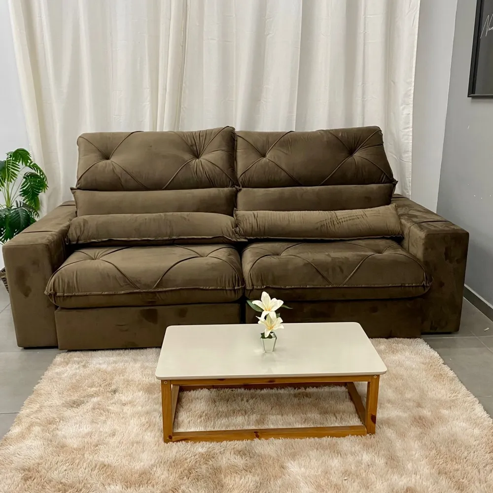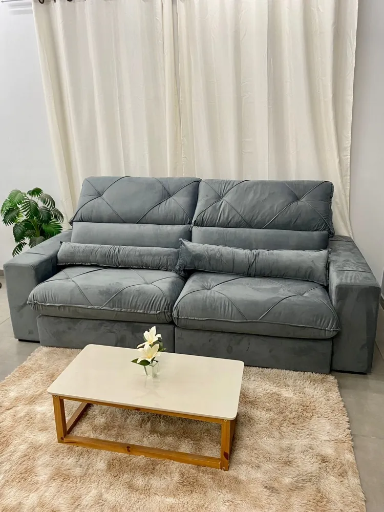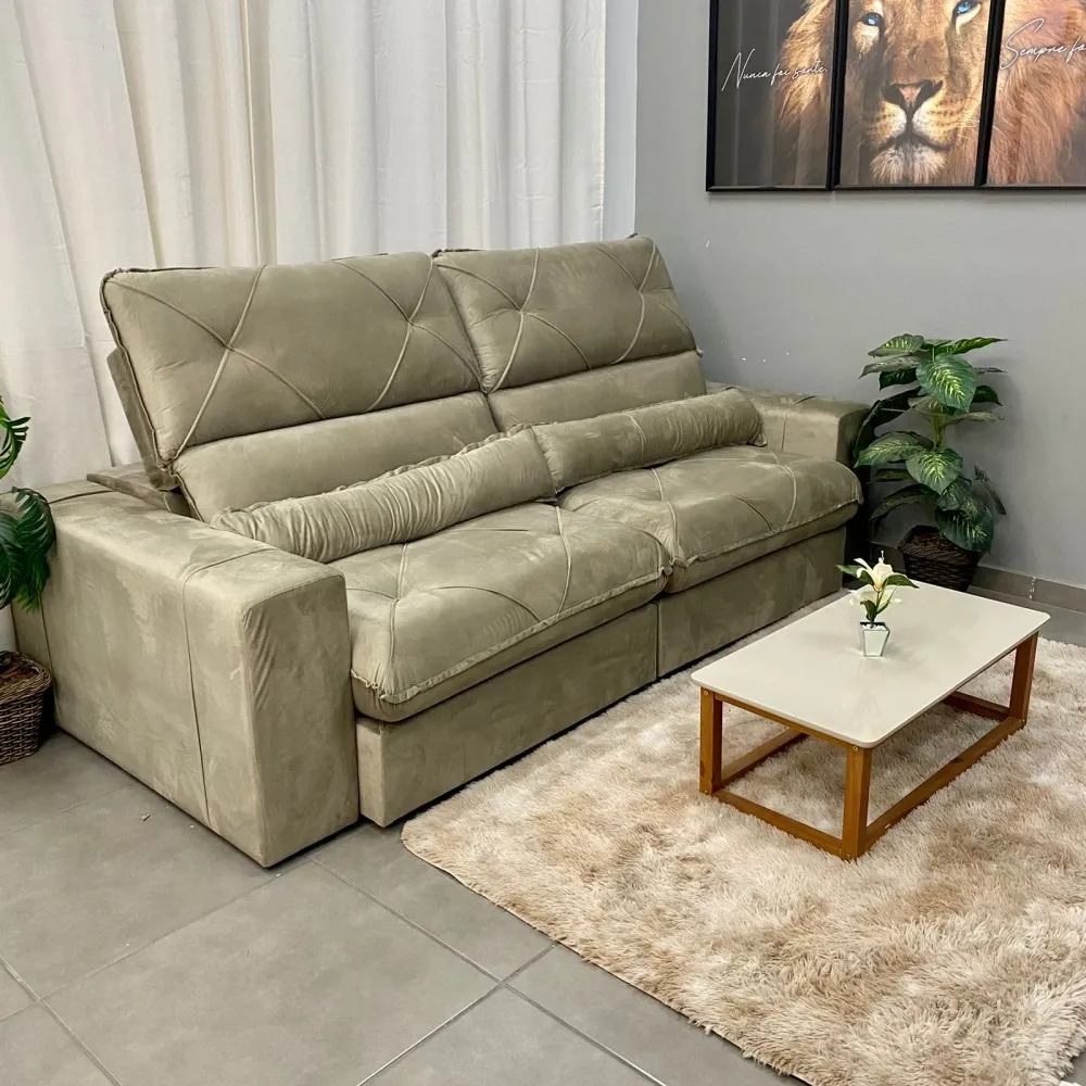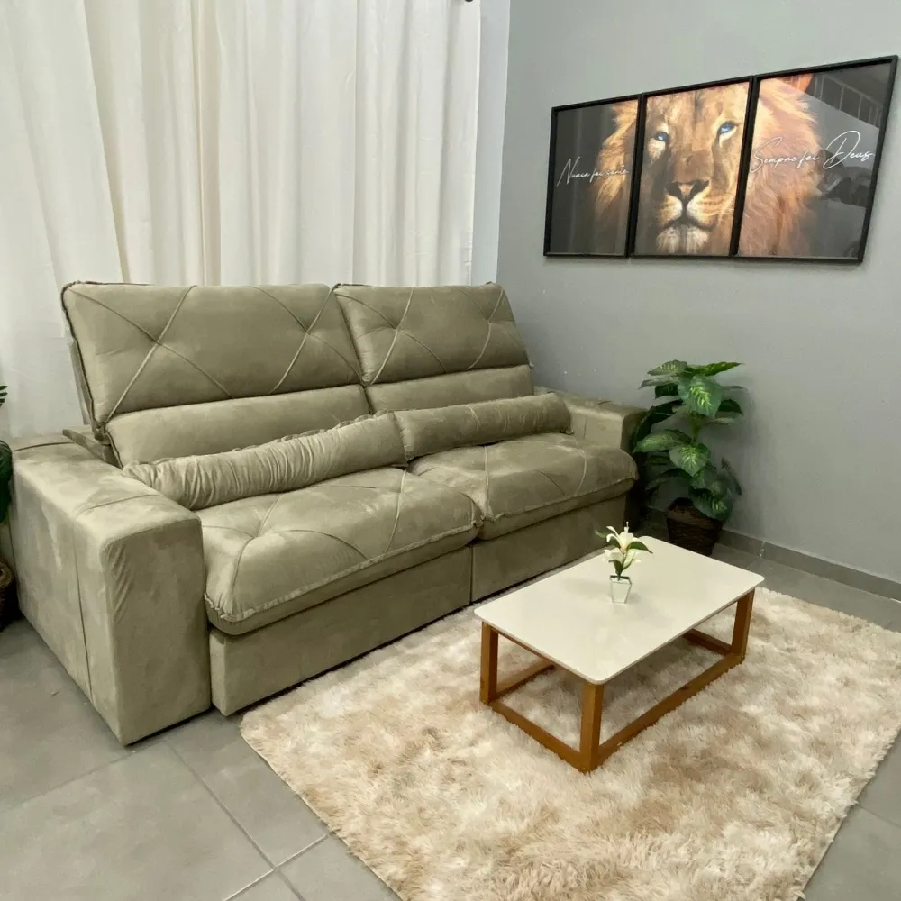 Sofá Retrátil e Reclinável Victory 250cm - Fabricante: Zarat Estofados - Cores em Bege Castor, Cinza, Marrom e Prata - Espuma D28 Hyper Soft - Molas Ensacadas - Encosto 100% fibra siliconada - Catraca 7 posições - Percinta Elástica Italiana - Rodízio de silicone - Madeira de reflorestamento - Pés de madeira Dimensões Altura: 120 cm Largura: 250 cm Profundidade Fechado: 130 cm Profundidade Aberto 180 cm